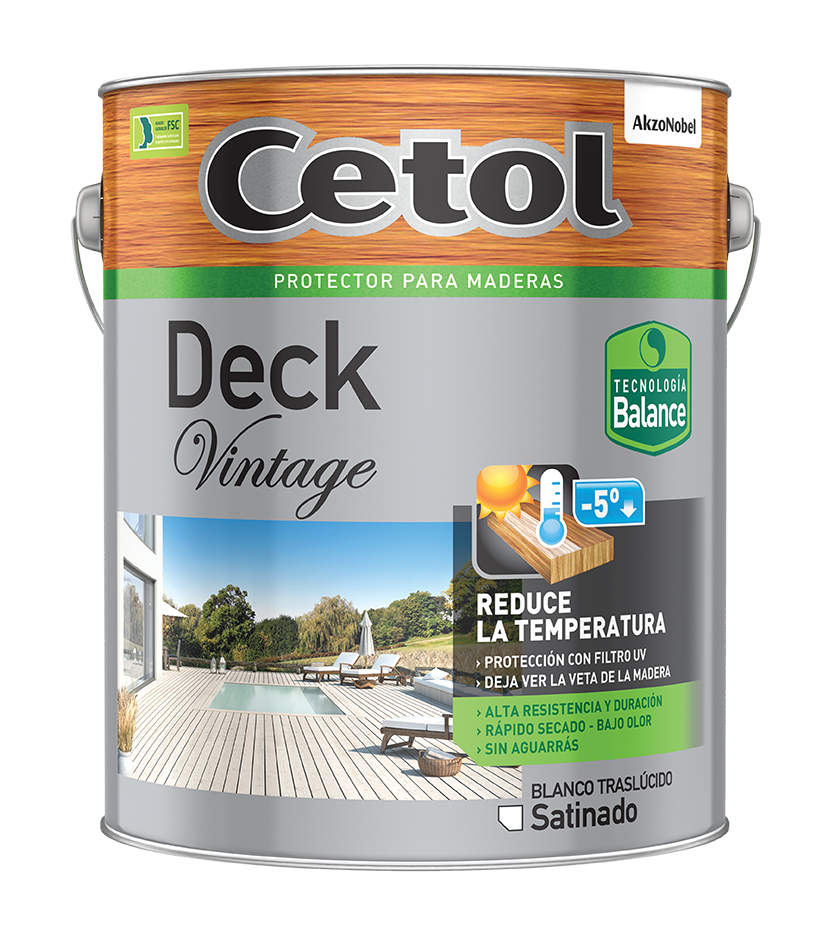 Al igual que todos los productos Cetol, se diferencia de barnices y productos usados tradicionalmente en las maderas por NO AMPOLLARSE, DESCASCARARSE NI CUARTEARSE. Cetol Deck Vintage posee una formula revolucionaria que hace que se reduzca la temperatura de tus decks evitando el calentamiento. Ofrece una opción de color blancuzco obteniendo una decoración distinta e impactante. La tecnología Balance ofrece una alta performance que, de forma práctica, con su bajo olor y rápido secado hace las cosas más fáciles. Su película microporosa con aditivos especiales, permite que Cetol penetre profundamente en la madera, dejando que respire su propia humedad y al mismo tiempo deja la superficie totalmente impermeable a la lluvia. Es ideal para pisos exteriores, evitando la formación de algas y hongos.